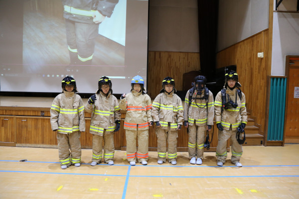 영등포소방서는 지난 27일 오전 양화중학교 체육관에서 1학년 학생 및 지도교사 220여명을 대상으로 진로체험 프로그램 ‘미래소방관 직업체험교실’을 운영했다. 사진은 학생들이 방화복을 입고 기념촬영을 하는 모습. (사진제공=영등포소방서)