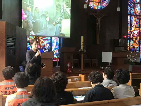 서울 구로소방서는 최근 개봉동 성당 신도 50여명을 대상으로 각종 재난재해 상황에 대응할 역량을 길러주는 시민안전파수꾼 양성교육을 실시했다. 사진은 서울소방재난본부 소속 시민강사가 강의를 진행하는 모습. (사진제공=구로소방서)