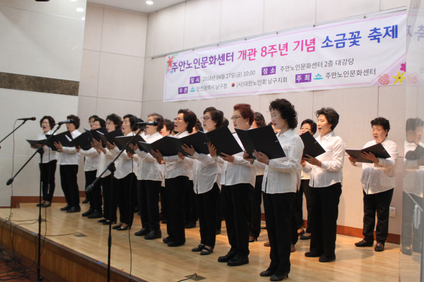 최근 인천 남구 주안5동 주안노인문화센터는 개관 8주년 기념 ‘소금꽃 축제’를 개최했다. 행사에서는 주안노인문화센터 소금꽃풍물단, 소금꽃한국무용단, 소금꽃합창단의 축하공연이 개최됐다. 사진은 참여자들이 공연을 선보이는 모습. (사진제공=남구청)
