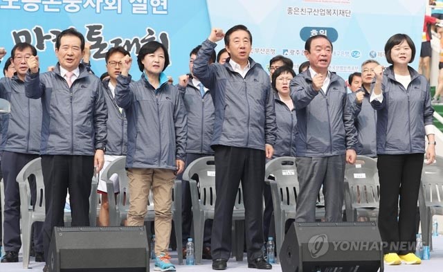1일 서울 송파구 잠실 올림픽 주경기장에서 열린 '한국노총 2018 노동절 마라톤대회'에서 참석자들이 ‘임을 위한 행진곡’을 함께 부르고 있다. 왼쪽부터 정세균 국회의장, 더불어민주당 추미애 대표, 자유한국당 김성태 원내대표, 민주평화당 장병완 원내대표, 정의당 이정미 대표.