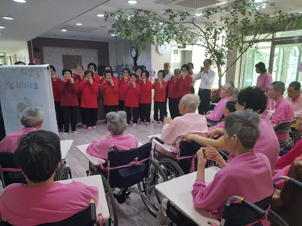 경기 포천시립영북도서관은 오는 7월4일까지 매주 목요일 한 시간씩 ‘도서관과 함께하는 즐거운 청춘’이란 주제로 오카리나 교육을 진행한다. 사진은 수업에 앞서 교육을 홍보한다는 취지로 지역내 한 요양원에서 오카리나 공연이 진행 중인 모습. (사진제공=포천시청)