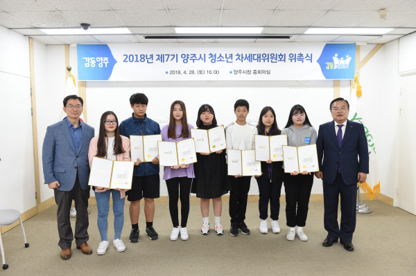 경기 양주시는 최근 시청 중회의실에서 청소년 정책발굴과 청소년 의견 수렴을 위해 활동하게 될 ‘제7기 양주시 차세대위원회’ 위촉식을 개최했다. 사진은 참여자들이 기념촬영을 하는 모습. (사진제공=양주시청)