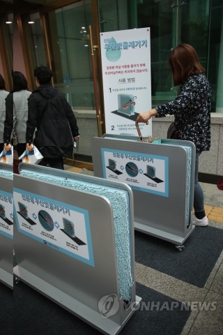 비가 내린 2일 오전 서울 세종로 정부서울청사에 출근하는 공무원들이 일회용 우산 비닐 씌우개 대신 친환경 우산 빗물 제거기를 사용하고 있다. 서울청사관리소는 일회용 비닐 사용을 줄이기 위해 이날부터 우산 빗물 제거기를 설치했다.
