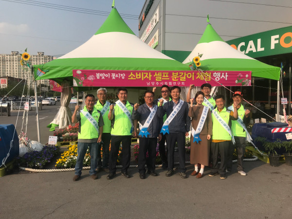 경기 남양주시 화훼연구회는 최근 '소비자 셀프 분갈이 체험행사'를 진행 중이다. 행사는 지난 3월부터 진접농협로컬푸드직매장에서 60종류의 다양한 화훼류를 전시 및 판매하면서 소비자가 직접 분갈이를 체험할 수 있도록 마련됐다. 사진은 행사 관계자들이 기념촬영을 하는 모습. (사진제공=남양주시청)