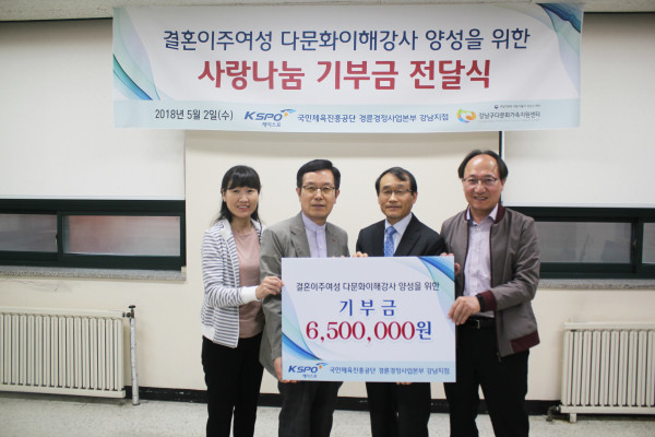 2일 서울 강남구다문화가족지원센터는 국민체육진흥공단 경륜경정사업본부 강남지점으로부터 결혼이주여성들이 안정적으로 자립하는 데 써달라며 사랑나눔 기부금 650만원을 전달받았다. 사진은 기부금 전달 후 기념촬영 하는 관계자들의 모습. (사진제공=강남구청)