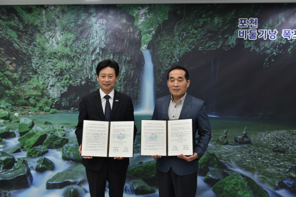 경기 포천시는 지난 1일 시청 회의실에서 경기도교육청 선정해 지질체험학습장으로 지정된 송우초등학교와 ‘한탄강 지질공원의 지질체험 확대를 위한 교류협력 협약’을 체결했다. 사진은 협약체결 후 관계자들이 협약서를 들고 기념촬영을 하는 모습. (사진제공=포천시청)
