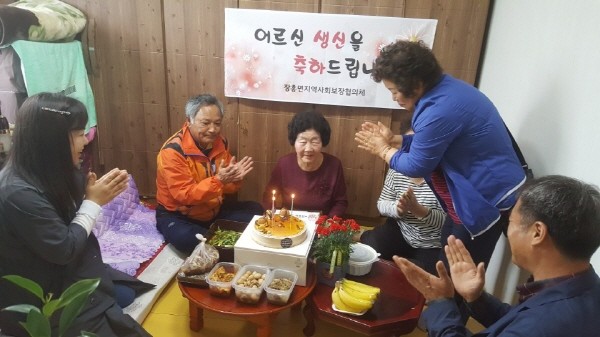경기 양주시 장흥면 지역사회보장협의체는 최근 생신을 맞은 지역내 저소득 홀몸노인 5명을 찾아가 생신잔치를 열고, 함께 축하하는 자리를 마련했다. 사진은 노인들이 축하 케이크를 바라보며 즐거워하는 모습.(사진제공=양주시청)