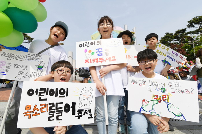 경기 오산시는 지난 5일 맑음터공원 일원에서 어린이들의 놀권리를 증진하고, 건강한 놀이문화를 확산시키자는 취지로 ‘제13회 오산시 어린이날 축제 한마당’을 개최했다. 사진은 ‘아동권리 퍼레이드’에 참여한 어린이들이 손피켓을 들고 있는 모습.(사진제공=오산시청)