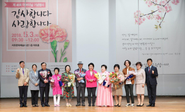 서초구가 최근 문화예술회관에서 지역 주민 700여명과 함께 하는 ‘서초 효도상’ 시상식을 열고 평소 효를 실천하고, 모범적인 가족 문화를 선도해 구민의 귀감이 된 주민 7명을 선발해 시상했다. 사진은 시상 후 구청장이 수상자들과 함께 기념촬영을 하는 모습. (사진제공=서초구청)