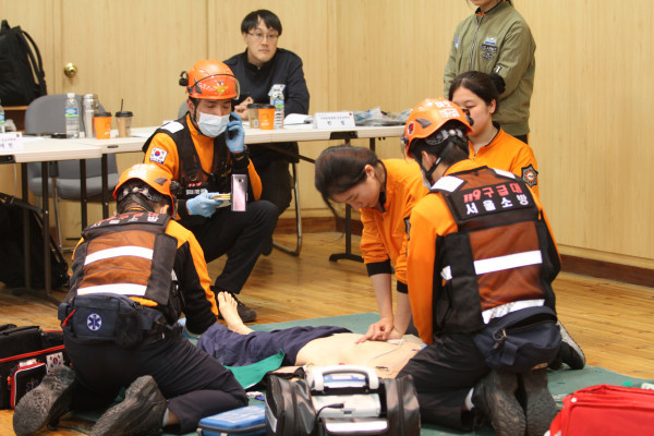 마포소방서는 최근 소방학교 구조구급교육훈련센터에서 열린 ‘2018년 소방기술 경연대회’ 화재 및 구급분야에서 2등과 3등을 차지했다. 사진은 소방관들이 구급(CPRㆍ전문소생술)분야에서 심폐소생술 실력을 선보이는 모습. (사진제공=마포소방서)