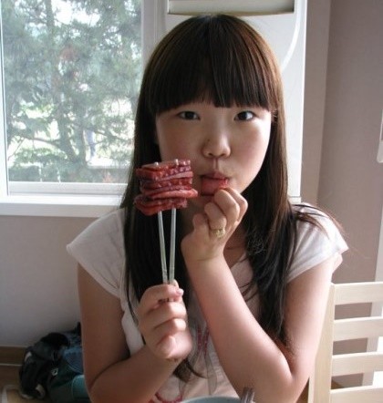 사진 속 수현은 지금보다 앳되고 풋풋한 얼굴로 스팸 여러장을 젓가락에 꽂고 스팸을 입에 문 채로 앙증맞은 표정을 짓고 있다.