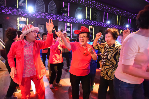 서울 중랑구에 소재한 유린원광종합사회복지관은 8일 오전 어버이날을 맞아 한국관 관광나이트클럽에서 노인 600명을 초대해 ‘유린 어르신 효축제’를 개최했다. 사진은 노인들이 신나게 춤을 추고 있는 모습. (사진제공=중랑구청)