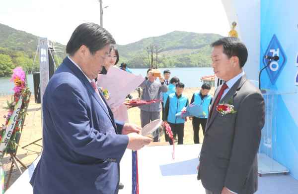 | ▲ 김기욱 서산시의원(오른쪽)이 최근 서산시 운산면 고풍리에서 열린 고풍지 통수식에 참석해 한국농어촌공사 측으로부터 감사패를 받고 있다. (사진제공=서산시의회) | ||
