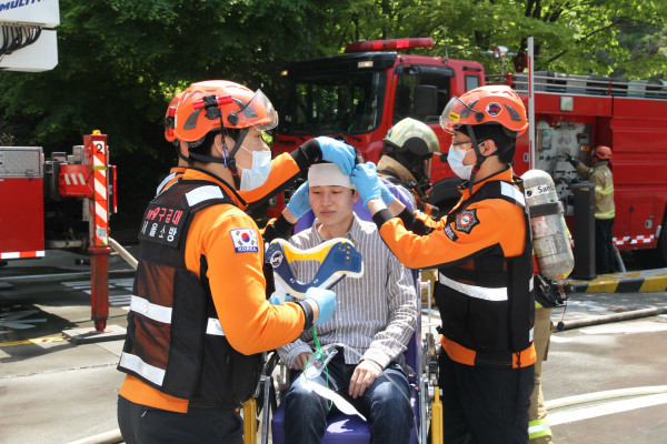 관악소방서는 9일 서울대학교 공과대학(관악구 신림동 소재)에서 실험 중 금수성 물질의 발화 상황을 가상해 소방서와 유관기관 등 차량 10여대, 인원 70여명이 동원돼 소방합동훈련을 실시했다. 사진은 소방관들이 환자를 치료하는 훈련을 하는 모습. (사진제공=관악소방서)