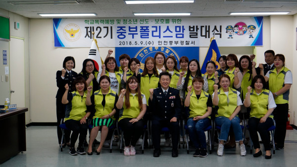 인천중부경찰서는 9일 2018년 학교폭력 예방을 위해 제2기 중부폴리스맘 발대식을 개최했다. 사진은 발대식에 참여한 관계자들이 기념촬영을 하는 모습. (사진제공=계양경찰서)