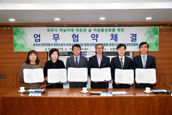 경기 포천시는 10일 ‘하늘아래 치유의 숲’의 이용 활성화를 위해 포천경찰서와 포천교육지원청, 포천소방서, 포천시어린이집연합회, 포천시지역아동센터연합회 등 5개 기관과 업무협약을 체결했다. 사진은 협약식에 참석한 관계자들이 협약서를 들고 기념촬영을 하는 모습. (사진제공=포천시청)
