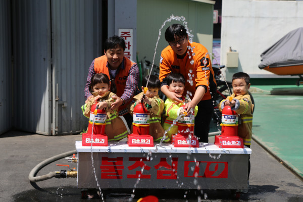 서울 영등포소방서는 9일 오전 유치원 원아들과 교사들을 대상으로 소방안전교육을 실시했다. 사진은 교육에 참여한 어린이들이 소화기 사용 실습을 하고 있는 모습. (사진제공=영등포소방서)