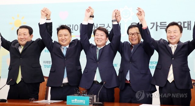 안철수 후보를 비롯한 바른미래당 수도권 지방선거 후보들이 10일 국회에서 열린 합동 출마선언식에서 함께 손을 들고 사진촬영을 하고 있다. 왼쪽부터 박주선 공동대표, 김영환 경기도지사·안철수 서울시장·문병호 인천광역시장 후보, 손학규 선대위원장.