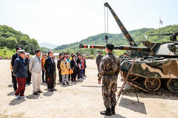 육군 제1기갑여단이 어버이날을 맞이해 경기 포천지역에 거주하는 참전전우회원을 비롯한 노인 67여명을 부대로 초청, 역사관 및 장비 견학에 이어 오찬 행사를 진행했다. 사진은 행사에 참석한 노인들이 K1A1 전차에 대해 설명을 듣고 있는 모습. (사진제공=포천시청)