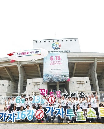 13일 오후 경기도 수원시 수원월드컵경기장에서 경기도선거관리위원회 관계자들이 비행선을 이용해 31일 앞으로 다가온 제7회 전국동시지방선거를 알리고 있다.