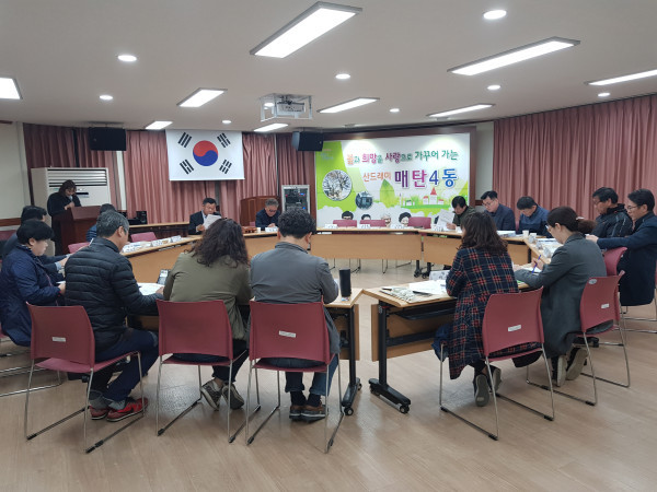 경기 수원시 영통구 매탄4동 주민자치위원회는 14일 행정복지센터 2층 산샘실에서 5월 월례회의를 개최했다. 사진은 관계자들이 공모사업으로 추진하는 ‘자동차 없는 날’등에 대해 논의하는 모습. (사진제공=영통구청)