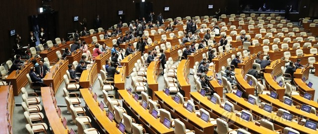정세균 국회의장이 ‘6.13 지방선거’ 출마의원들의 사직 안건 처리 등 국회 현안을 놓고 본회의를 소집한 14일 오후 더불어민주당 의원들이 본회의장에서 야당 의원들의 입장을 기다리고 있다.