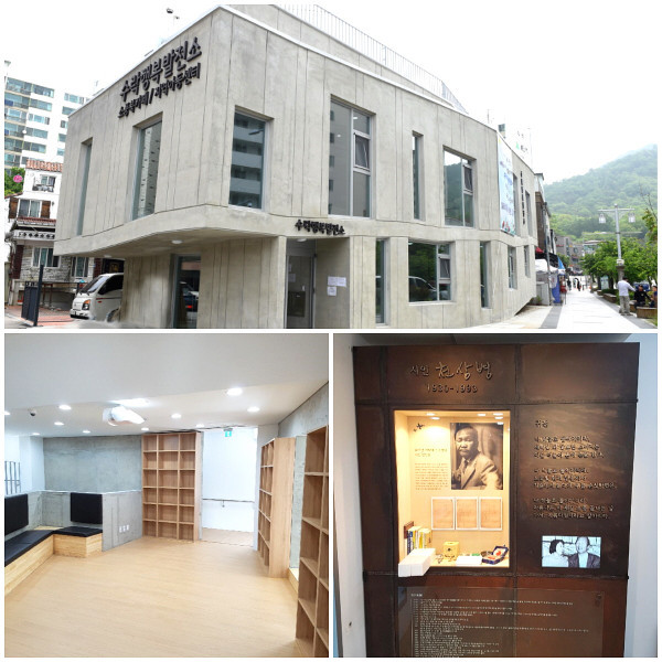 | ▲ 수락행복발전소의 외부 전경(위), 내부 전경(아래 왼쪽), 천상병 시인 전시대 전경(아래 오른쪽). (사진제공=노원구청) | ||