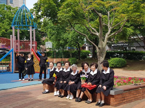 15일 경기 용인시 수지구보건소가 22명의 노인을 대상으로 운영 중인 1기 실버 이미지 메이킹 교실의 ‘옛날 교복입고 사진찍기’를 진행했다. 사진은 구청 광장 토월공원에서 교복을 입고 사진촬영을 하고 있는 노인들의 모습. (사진제공=용인시청)