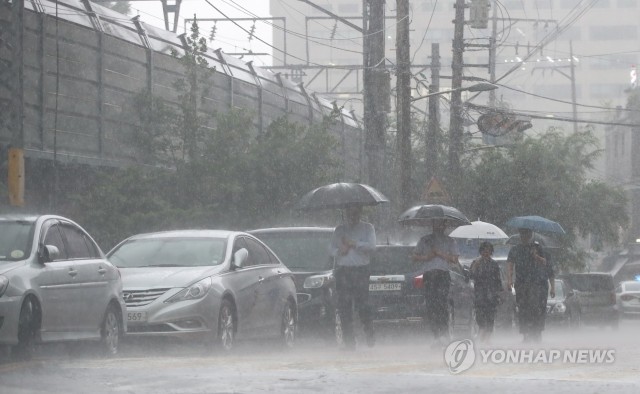 서울 등 수도권 지역에 장맛비와 같은 폭우가 쏟아진 16일 서울 서대문구 한 도로에서 우산을 쓴 시민들이 발걸음을 서두르고 있다.