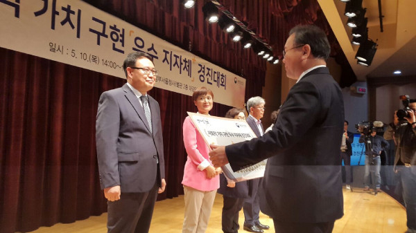 서울 은평구가 최근 행정안전부에서 개최한 ‘사회적 가치 구현 우수사례 경진대회’에서 우수 지자체로 선정돼 행정안전부 장관상과 재정인센티브 5000만원을 받았다. 사진은 시상식 진행 모습. (사진제공=은평구청)