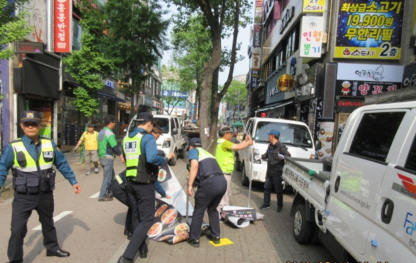 경기 부천시는 지난 14일 경찰과 합동으로 불법유동광고물 단속을 실시했다. 이날 시 광고물1·2팀 등 50여명으로 단속반을 구성해 중동 현대백화점 주변 상업지역에 설치된 배너 등 불법유동광고물을 단속했다. 사진은 경찰과 단속반원들이 광고물을 철거하는 모습. (사진제공=부천시청)