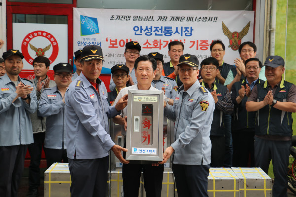 최근 경기 안성소방서가 안성·중앙시장에 화재 발생시 누구나 쉽게 사용할 수 있는 ‘보이는 소화기함’을 설치했다. 사진은 보이는 소화기함 전달식에 참석한 소방서 관계자와 시장 상인들이 소화기함을 들고 기념촬영을 하는 모습. (사진제공=안성시청)
