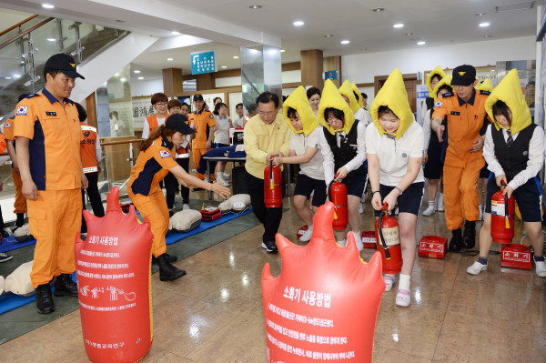 동대문구는 16일 지역내 해성국제컨벤션고등학교에서 ‘국민참여 지진 대피훈련’을 진행했다. 이날 훈련에는 김부겸 행정안전부 장관이 참석해 훈련을 함께 했다. 사진은 김부겸 행정안전부 장관과 학생들이 소화기 사용법을 배우고 있는 모습. (사진제공=동대문구청)