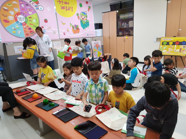 경기 평택시 안중보건지소가 오는 12월까지 매주 수요일 지역내 어린이집 및 유치원 어린이를 대상으로 '영양테마체험교실'과 '치아튼튼이교실'을 운영한다. 사진은 16일 영양테마체험교실에 참가한 어린이들이 교육받고 있는 모습. (사진제공=평택시청)