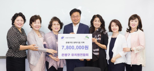 지난 15일 서울 은평구 사립유치원연합회가 은평구민장학재단에 장학금으로 써 달라며 지역내 31개 사립유치원에서 25만원씩 모은 돈 총 780만원을 기탁했다. 사진은 기탁식 후 기념촬영을 하고 있는 구청장과 연합회 회원들의 모습. (사진제공=은평구청)