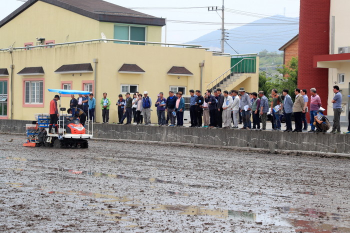 벼직파 확대재배 방안과 재배기술에 대한 교육 및 직파기계 활용방법 설명에 이어 이종섭 시범농가 4,000㎡ 면적에 승용점파 파종기를 이용한 직파 시연이 진행됐다.