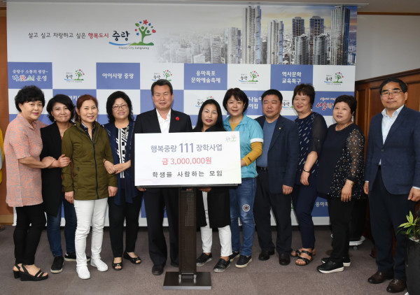 학생을 사랑하는 모임(학사모)은 17일 서울 중랑구청에 ‘행복중랑 111 장학사업’ 장학금 300만원을 기탁했다. 사진은 구청장 및 학사모 관계자들이 기념촬영을 하는 모습.(사진제공=중랑구청)