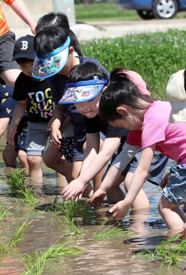 23일 오전 강원 춘천시 강원도농업기술원 인근 논에서 강원대학교 부속어린이집 원아들이 모내기 체험을 하고 있다.