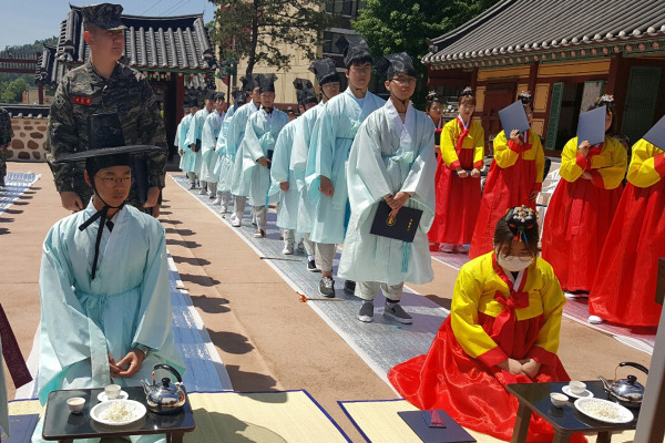 지난 21일 인천 강화군 강화향교가 향교 대성전에서 성년을 맞는 학생과 군부대 장병을 대상으로 '제46회 성년의 날' 행사를 개최했다. 사진은 성년식을 진행하고 있는 학생들과 장병들의 모습. (사진제공=강화군청)