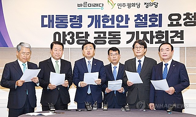 바른미래당, 민주평화당, 정의당 대표 및 원내대표가 23일 오전 국회 귀빈식당에서 개헌안 철회를 요청하는 야3당 공동기자회견을 열고 회견문을 낭독하고 있다. 왼쪽부터 바른미래당 김동철, 박주선, 김관영, 정의당 김종대, 민주평화당 김광수, 장병완.