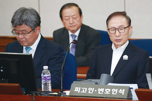 뇌물수수와 다스 횡령 등 혐의로 구속기소 된 이명박 전 대통령이 23일 오후 서울중앙지법에서 열린 첫 공판에 출석하고 있다.