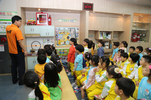 영등포소방서는 23일 오전 도림동에 위치한 돈보스꼬 유치원 원아와 교사들을 대상으로 '소방안전교육'을 실시했다. 사진은 소방관이 어린이들에게 소화전 사용방법에 대해 설명하는 모습. (사진제공=영등포소방서)