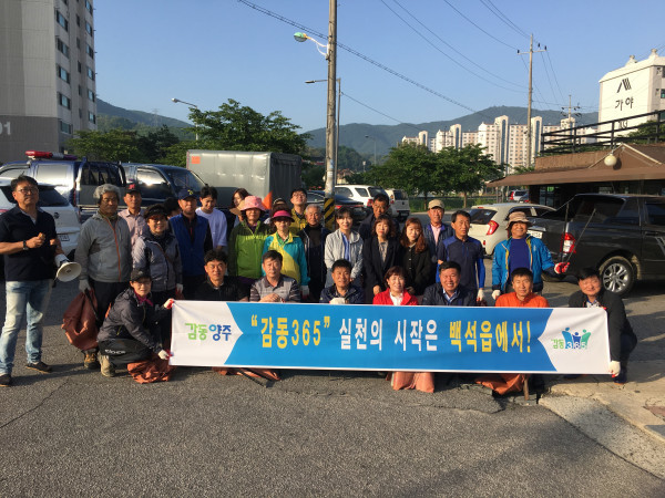 경기 양주시 백석읍은 25일 오전 깨끗한 백석읍을 만들기 위해 복지리 일대에서 가로환경대청소를 실시했다. 사진은 청소 참여자들이 기념촬영을 하는 모습. (사진제공=양주시청)