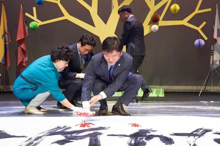 경기 용인시의회 의원들이 최근 삼가동 소재 문화예술원 마루홀에서 ‘세계 속의 용인, 하나되는 용인’이란 주제로 열린 ‘세계인의 날 기념행사’에 참석했다. 사진은 행사에 참여한 시의장 등 관계자들이 붓글씨를 작성하고 있는 모습.(사진제공=용인시청)