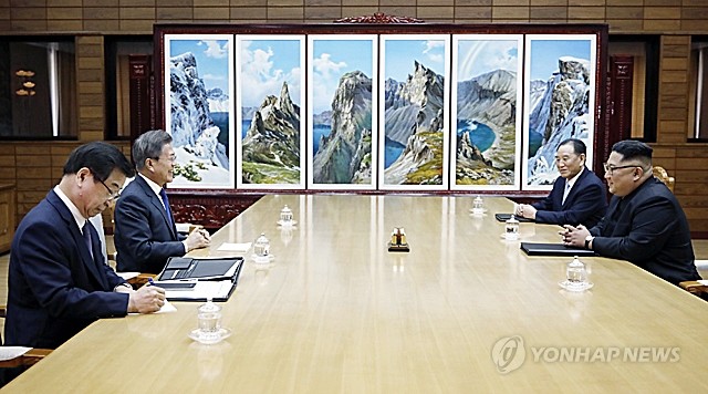 문재인 대통령과 북한 김정은 국무위원장이 26일 오후 판문점 북측 통일각에서 열린 제2차 남북정상회담에서 만나 얘기를 나누고 있다. 이 자리에는 서훈 국가정보원장과 김영철 북한 노동당 중앙위원회 부위원장 겸 통일전선부장이 배석했다.
