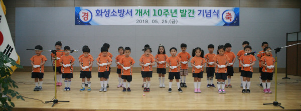 경기 화성소방서는 지난 25일 오전 11시 소방서 3층 대강당에서 '개서 10주년 기념행사'와 '10년의 발자취' 책자 발간 행사를 열었다. 사진은 한국119소년단원인 숲속코코 유치원 어린이들이 소방동요를 부르며 공연하는 모습. (사진제공=화성소방서)