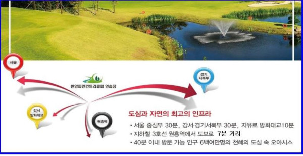 한양파인CC 골프 연습장은 서울중심부에서 30분, 강서경기 서북부 지역에서 30분, 자유로 방화대교에서 10분 내에 도착할 수 있으며, 40분 이내 방문 가능 인구6백여만명의 천혜의 도심 속 오아시스로 도심과 자연의 최고의 인프라를 형성하고 있다.