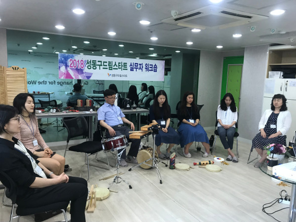 성동구는 지난 28일 굿네이버스 좋은마음센터 성동지부에서 아동통합사례관리 서비스를 제공하고 있는 드림스타트 실무자의 역량 강화 및 스트레스 예방을 위한 워크숍을 개최했다. 사진은 음악 힐링 워크숍이 진행 중인 모습. (사진제공=성동구청)