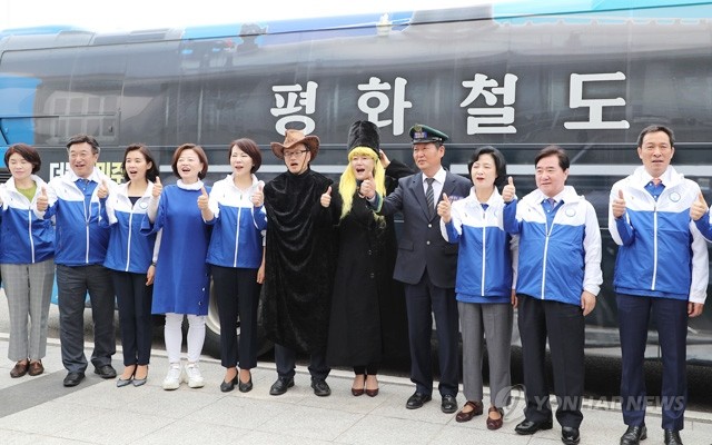 30일 오전 국회에서 열린 더불어민주당 ‘평화철도111 유세단 출정식’ 에서 추미애 대표와 중앙역장에 임명된 정청래 전 의원 , 만화 은하철도 999의 메텔과 철이의 캐릭터로 분장한 이재정과 박주민 의원 등이 버스 탑승에 앞서 파이팅하고 있다.