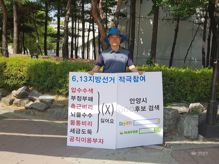 손 원장은 "안양시민들의 올바른 안양시장 선택에 도움을 드리고자 1인 시위를 하게됐다"며 "온갖 비리 의혹이 있는 후보가 만일 시장이 된다면 안양시의 앞날이 걱정되기 때문이다"라며 60만 안양시민들의 올바른 선택을 호소했다.